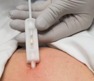 2. During an in-office visit, which only takes a few minutes, the insertion site is numbed, and a small incision is made in the upper buttocks.