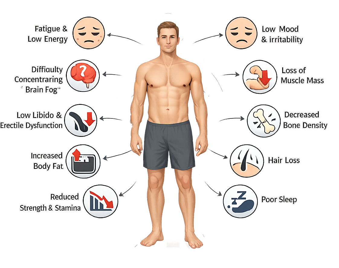 Symptoms consistent with low testosterone and other cases of male hormonal imbalance may include: